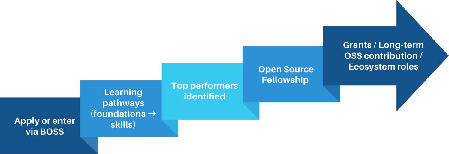 We are measuring success differently than before. Graduation matters, but so does retention. We care about how many developers continue after BOSS through structured pathways. We care about whether there is a clear progression from graduation to fellowship, and from fellowship to grants. We care about real open‑source output, including meaningful contributions and merged pull requests. We care about whether alumni are still contributing six to twelve months later. And we care deeply about faculty satisfaction and sustainability.